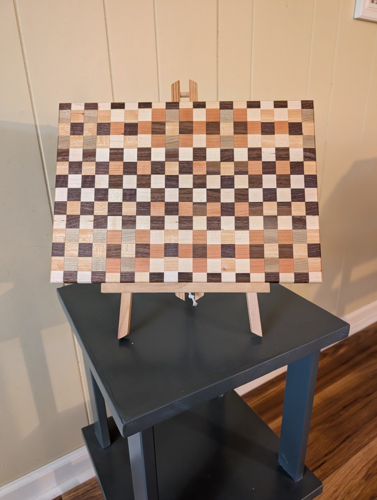 Made from Cherry, Walnut, and Maple. 10″ x 14″. Rounded edges on each side. $70.