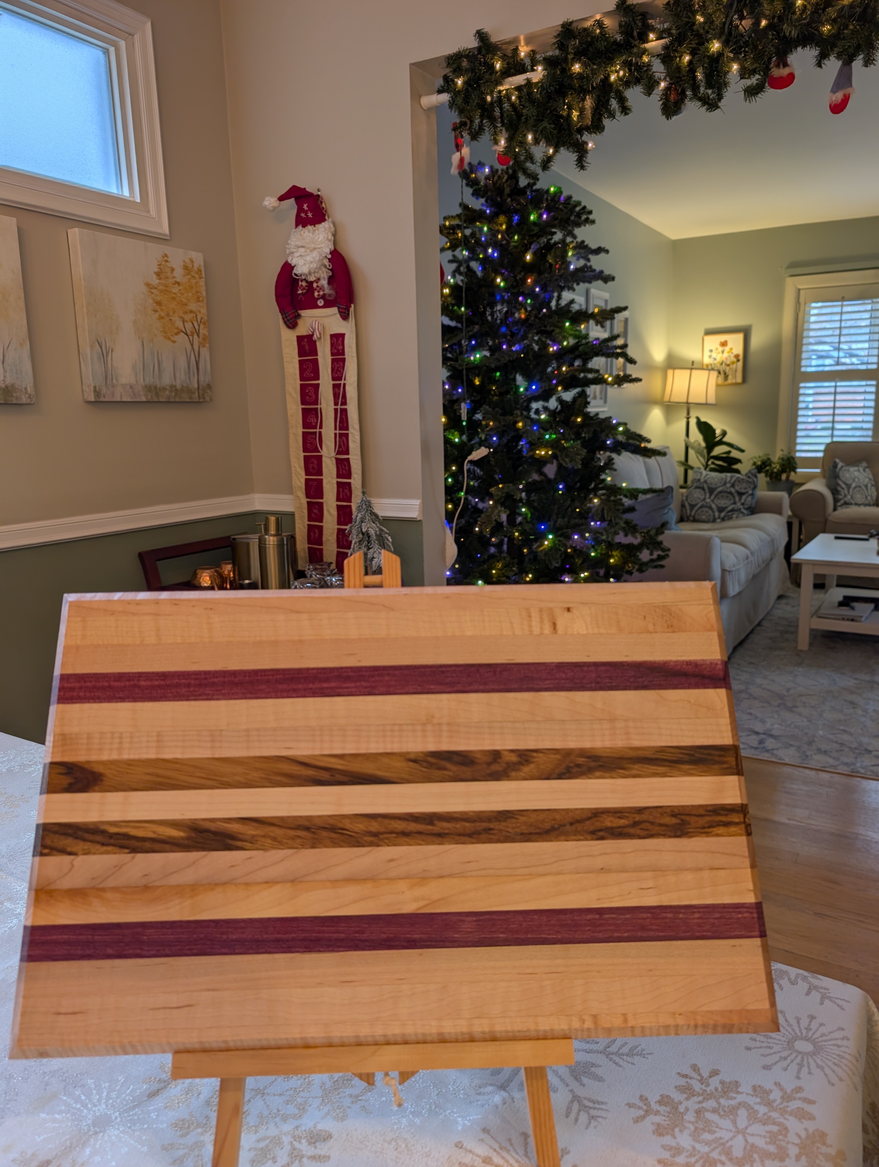 Made from Maple, Zebrawood, and Purpleheart. 11″ x 16″. 45-degree chamfered edge on one side. $65.